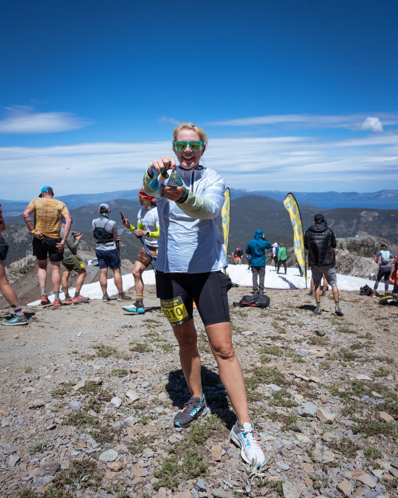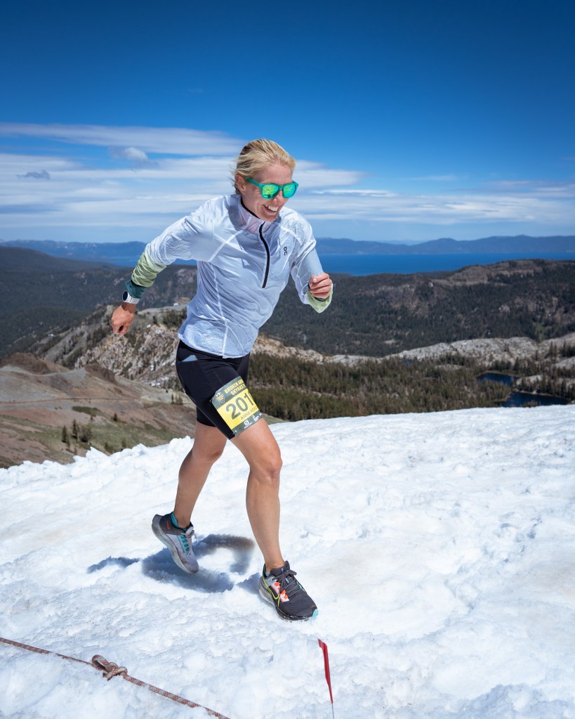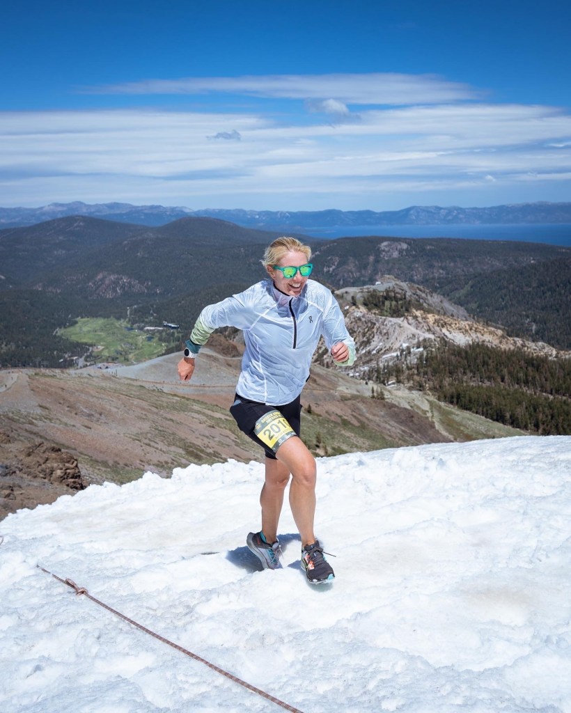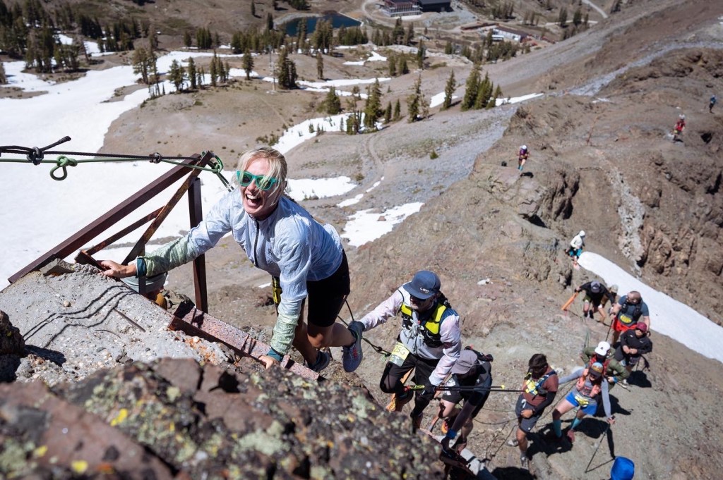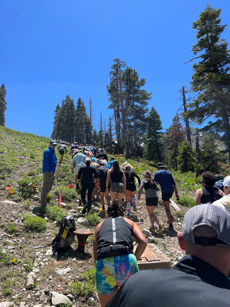 A massive grass start in a steep mountain turned out to be more difficult than I expected. It seems that I need to run, but I don’t have power in my legs at all; I understand that soon there will be a single trail, and then I won’t be able to overtake anyone, but I don’t feel the strength in myself to do it now on the hill. I decided to stay in the group and just enjoy. I got a lot of fun from running uphill, from changing landscapes due to the elevation difference, and from the incredible energy of this race. This energy is so lacking in ultramarathons, where everything is often very sad. The course, the mood, the weather, everything is great during this race. We climb to the highest point of the Olympic Valley Peak, commonly known as “Squaw Peak.” To overcome this point and go down further, you need to climb the famous iron stairs. It seems that all the participants are just waiting for this moment – the stairs. The closer we are to the peak, the stronger the voices of people near the stairs are heard. A large support group and volunteers are waiting for the runners. Gradually making our way through the stones and climbing higher and higher already to the level of snow, we can see the stairs and the finish line. The iron staircase looks the same excitation as in the photo. Volunteers help the runners, and a photographer sitting on a cliff on a stone captures every moments. After the iron staircase, a snow staircase leads to the finish line, no less exciting than the iron one. There are many runners at the top and a very festive atmosphere.
