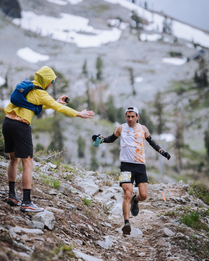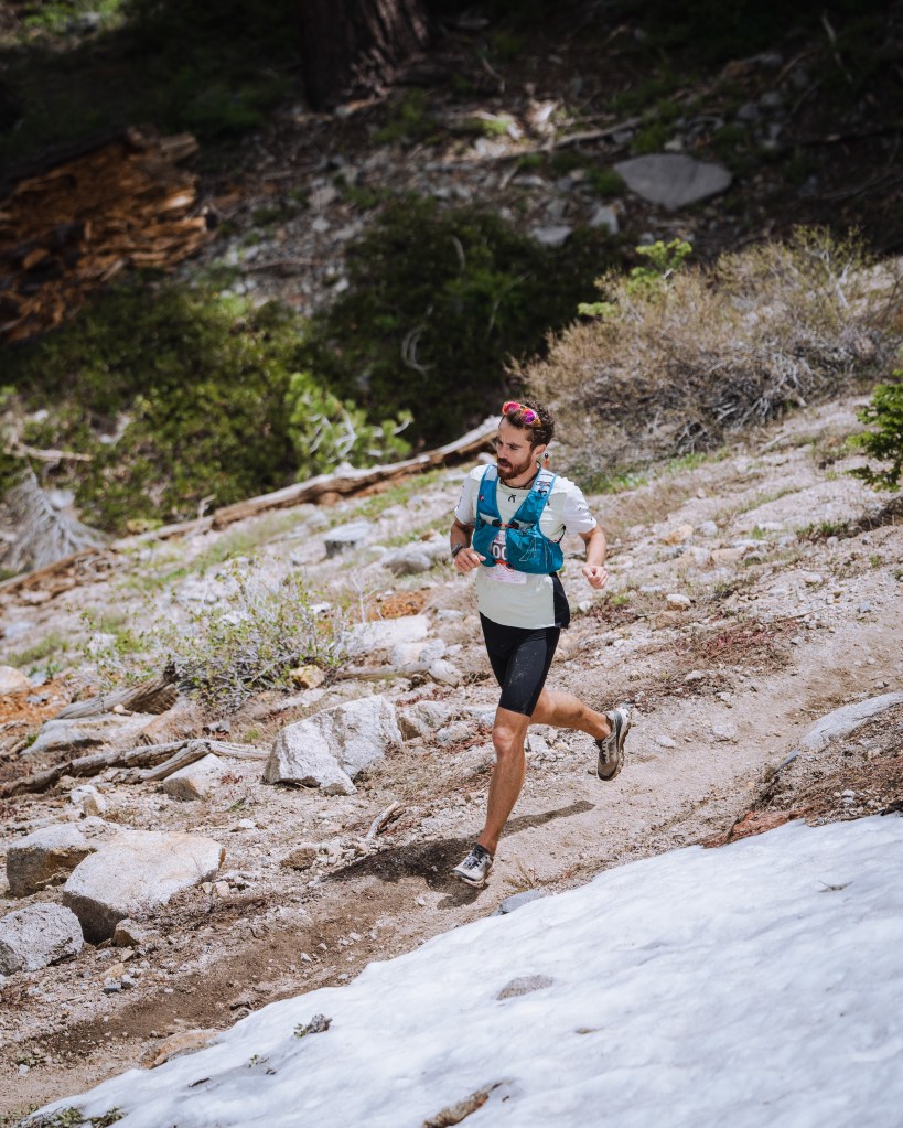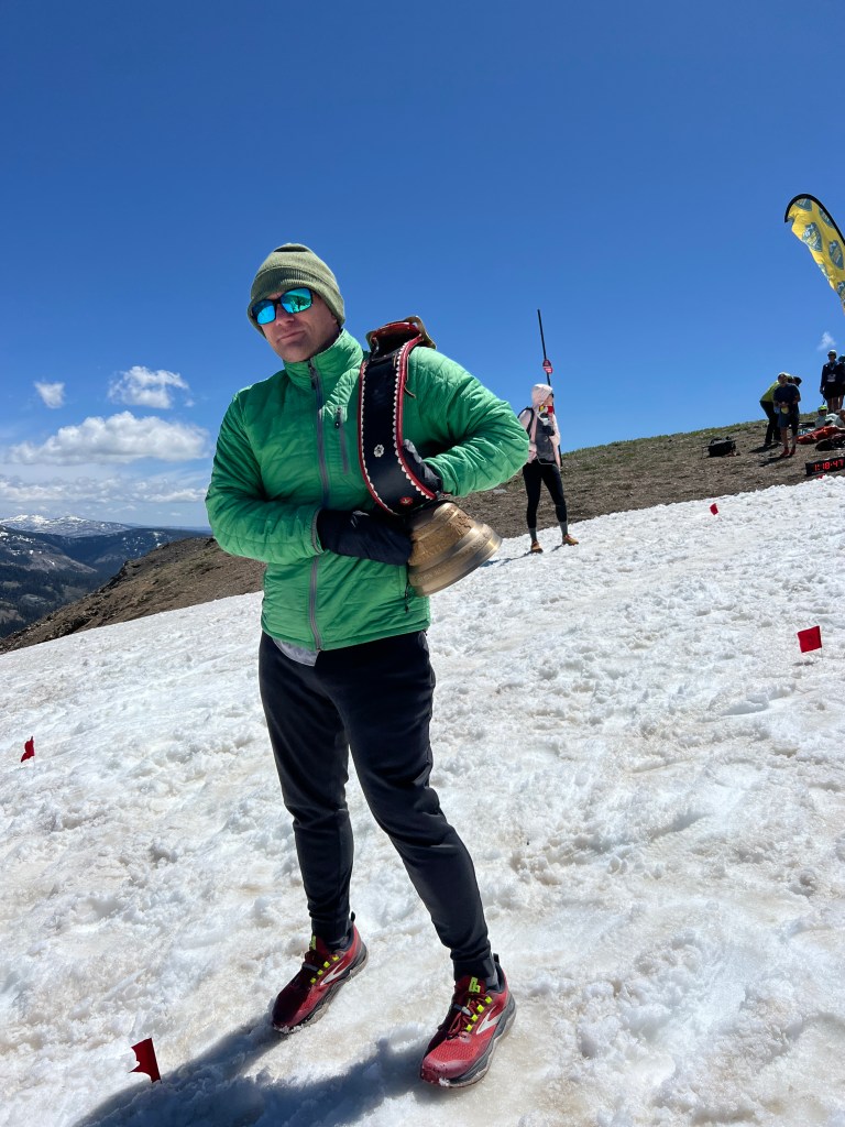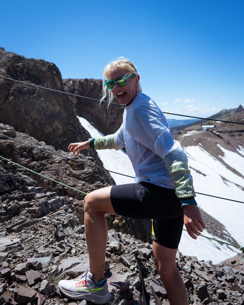 A massive grass start in a steep mountain turned out to be more difficult than I expected. It seems that I need to run, but I don’t have power in my legs at all; I understand that soon there will be a single trail, and then I won’t be able to overtake anyone, but I don’t feel the strength in myself to do it now on the hill. I decided to stay in the group and just enjoy. I got a lot of fun from running uphill, from changing landscapes due to the elevation difference, and from the incredible energy of this race. This energy is so lacking in ultramarathons, where everything is often very sad. The course, the mood, the weather, everything is great during this race. We climb to the highest point of the Olympic Valley Peak, commonly known as “Squaw Peak.” To overcome this point and go down further, you need to climb the famous iron stairs. It seems that all the participants are just waiting for this moment – the stairs. The closer we are to the peak, the stronger the voices of people near the stairs are heard. A large support group and volunteers are waiting for the runners. Gradually making our way through the stones and climbing higher and higher already to the level of snow, we can see the stairs and the finish line. The iron staircase looks the same excitation as in the photo. Volunteers help the runners, and a photographer sitting on a cliff on a stone captures every moments. After the iron staircase, a snow staircase leads to the finish line, no less exciting than the iron one. There are many runners at the top and a very festive atmosphere.