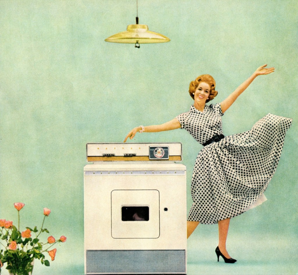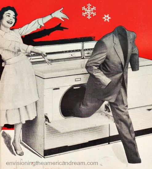 “In the 1950s, one angle employed to encourage housewifery was to convince women that there was glamor to be found in drudgery. In this Ivory Snow commercial from the period, the home was a “castle,” the housewife was a “storybook princess,” and the laundry was “her trousseau” (which, according to dictionary.com, means “the clothes, household linen, and other belongings collected by a bride for her marriage”). The idea that women were expected to clean all day long is also contradicted in many books and magazines for women that were published in the 50s. From Mrs. America Homemaker’s Guide (1954 – by Wanda Jennings), comes this advice: