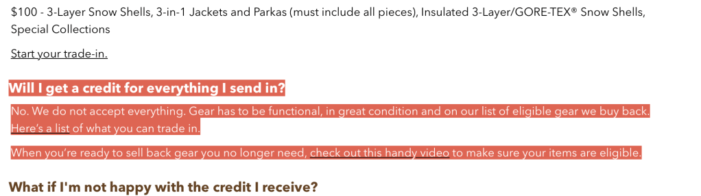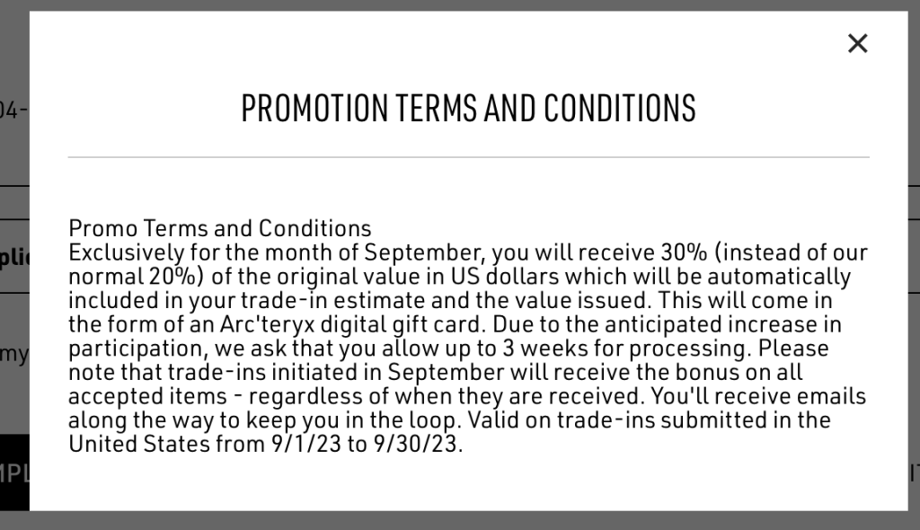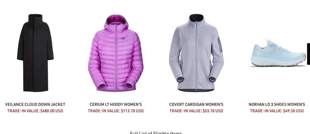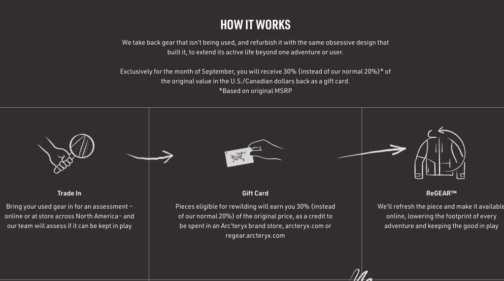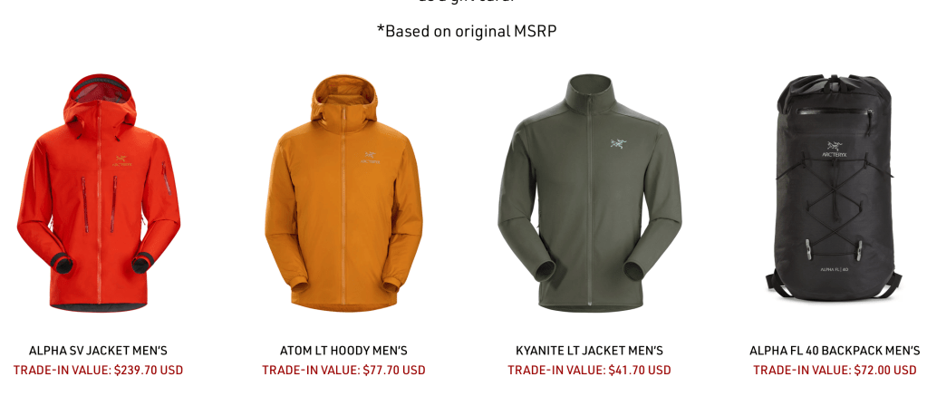 Arc’teryx has recently launched the Used Gear program, allowing customers to sell their lightly used Arc’teryx products back to the brand in exchange for a gift card for 20% of the original retail price of that item. Arc’teryx will then refurbish these items and sell them on a special section of their website at lower prices. While the 20% return rate may seem low, they occasionally offer promotions, like the 30% back in September 2023. However, you only receive a gift card, not cash. Prices on website is ok, could be low though. I ordered one item, but seems like it lost, so I had more negative experience now.