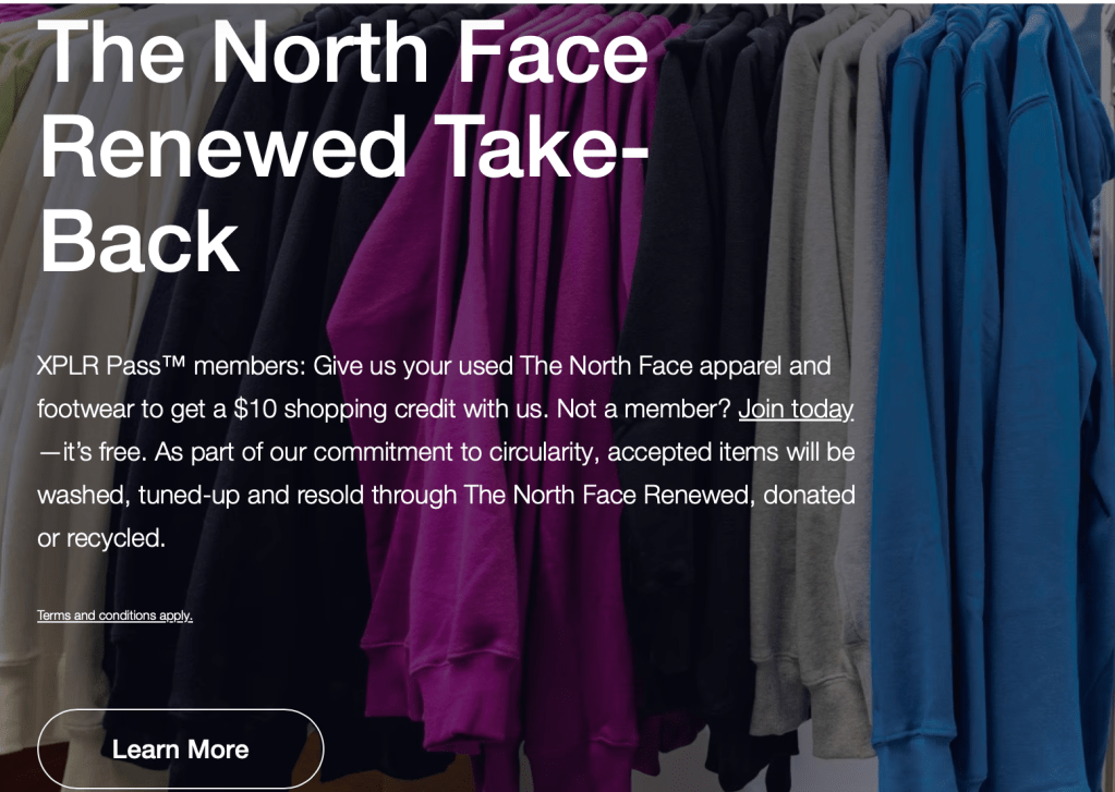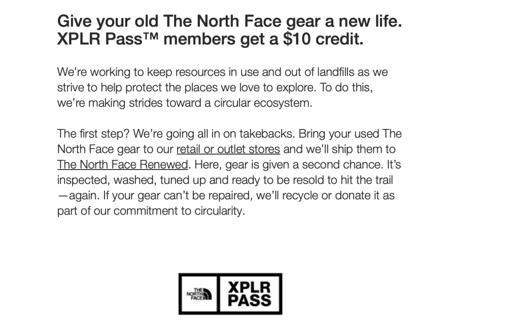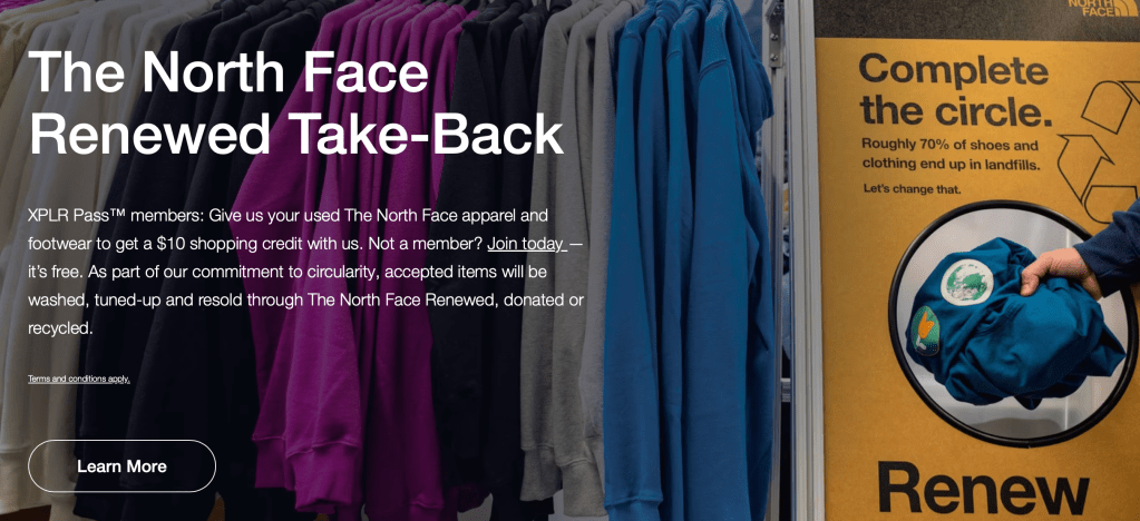The North Face program called “Clothes The Loop,” which focuses on donating used gear. Customers can bring gear to a retail or outlet store and receive a $10 credit. The idea of recycling materials back to the brand is great, but it could be expanded to include all recyclable clothing. This way, the brand could make new items from returned clothing, reducing waste. I did not get it fully, because seems like they accept all gear, but at the section SHOP Circularity you can find just few items. So clearly they are not resell the items, but remade them. In general the idea is great, but for now is too small. Like I said before a lot of gear can skip some stages and just go from customers back to brands and brands can recycle it to the new items like :