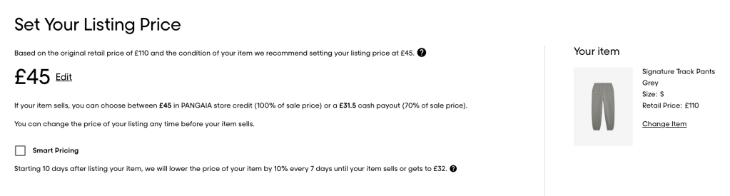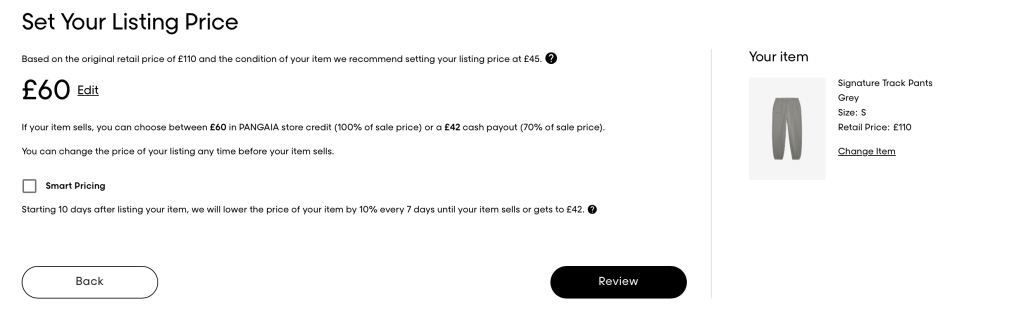 Pangaia, one of my favorite brands, has also launched a program, but it’s currently only available in the UK. Hopefully, it will expand to other countries soon. The concept seems excellent, and the best part is that you don’t have to send your items to the brand. You can take photos yourself, list the items, and set the prices. Even better, you can get 70% of the sale price in cash or 100% in store credit, which is quite fair.