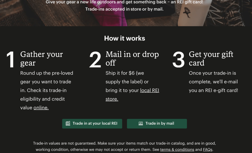 Online you can sell and buy gear, so it is a bit different from what you can find in store, but prices are great. You can see your potential credit online and decide if it worth it. You’ll get only gift card, no cash. Prices very friendly for buyers and also sellers get back some money as well.