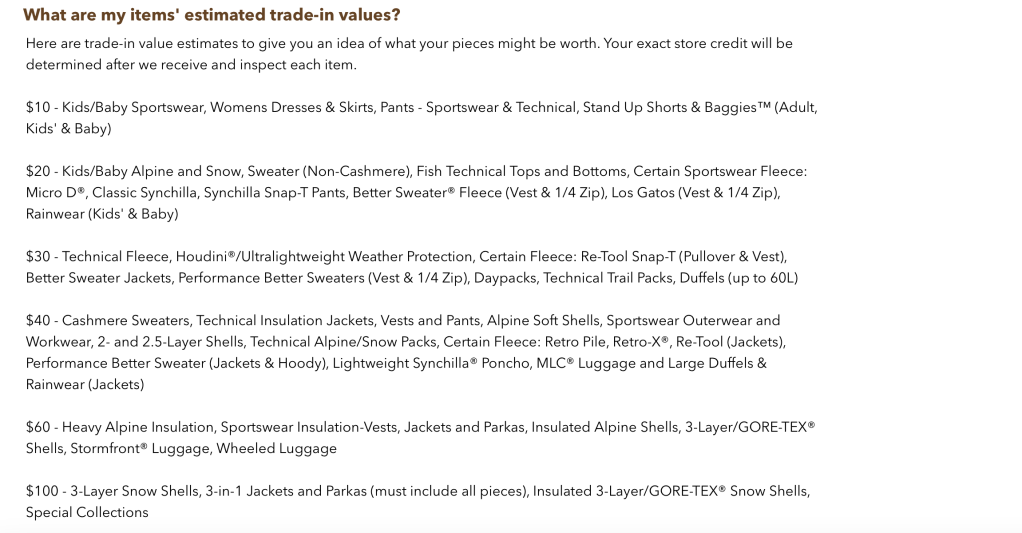 Patagonia, with its Worn Wear program, has a very user-friendly website, and the prices seem fair for both buying and selling. The bonus is that you can find rare or unique colors and discounted styles. I’ve purchased several items from them and love everything about it. Some items may seem a bit pricey, but in general, you can find great deals. They are also transparent about what you can trade in.