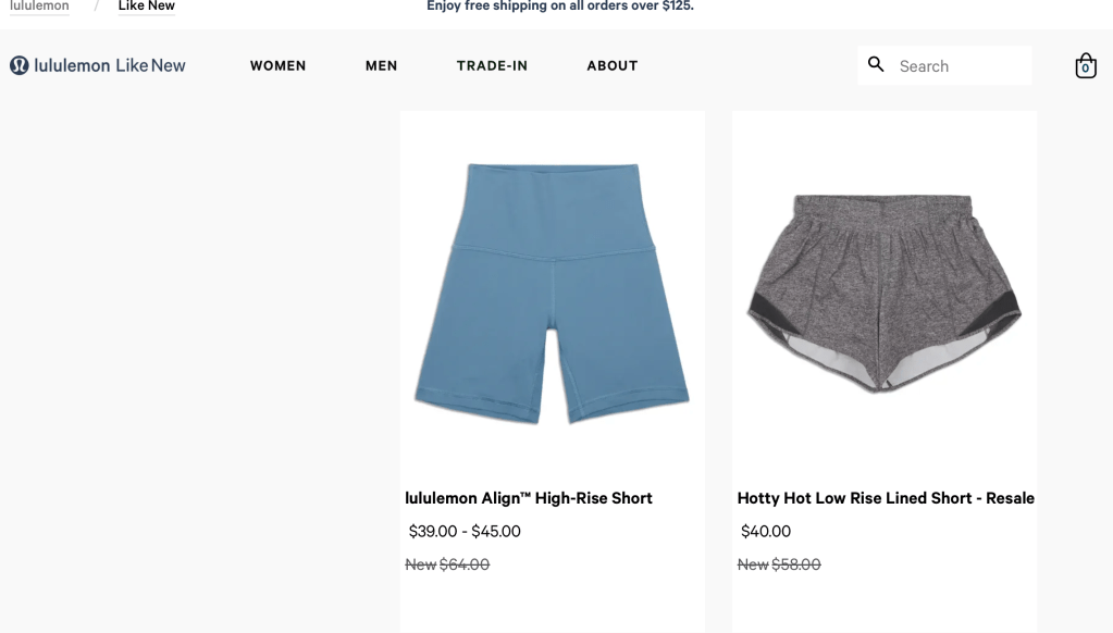 Lululemon launched its program a couple of years ago, and you can really find everything you need there. The coolest thing is that you can find items that have captured your heart but are no longer in production, which Lululemon often does. So it’s a paradise for fans and connoisseurs. However, the platform has some drawbacks, as we’ll discuss later. The search function and sorting can be problematic, and the item descriptions can be confusing. For example, shorts with a 6-inch inseam might be listed under the same category as those with 8 or 10-inch inseams.
