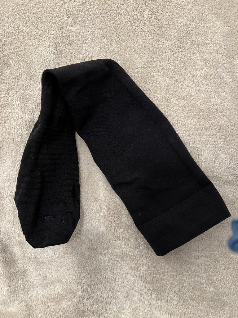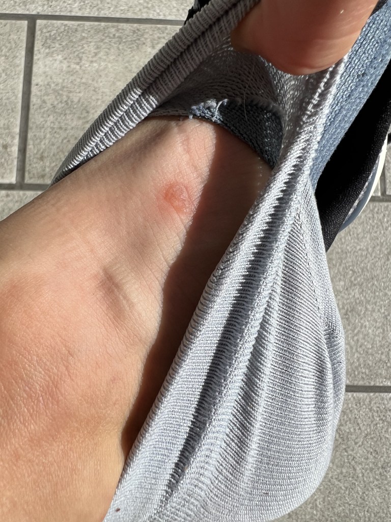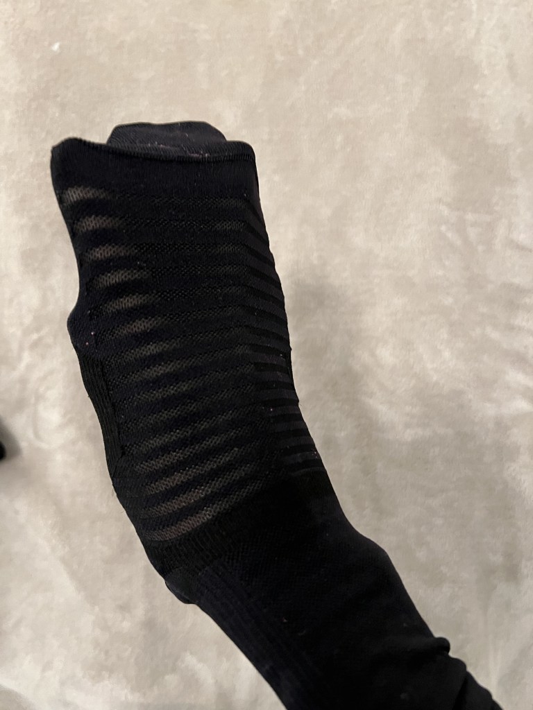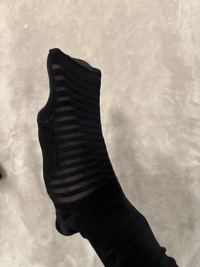 На этот раз я совершила ошибку с носками и кроссовками. Или это из-за новых носков, или из-за моих новых худых стоп, но место, где язычок соприкасается со шнуровкой, сверху сбоку изнутри, начало болеть. Это место натерлось и в итоге образовался ужасный синяк. По идее, это место на язычке кроссовок даже уплотнено, чтобы защитить от давления шнуровки, но мой язычок съезжает вбок оголяя это место стопы и шнуровка начинает натирать и набивать. А новые высокие гольфы Nike в этом месте очень тонкие. Всё вместе создало очень болезненный и неприятный эффект. Раньше я бегала в более плотных гольфах, но это место также было очагом небольшого давления, но видимо более плотная ткань защищала лучше.
